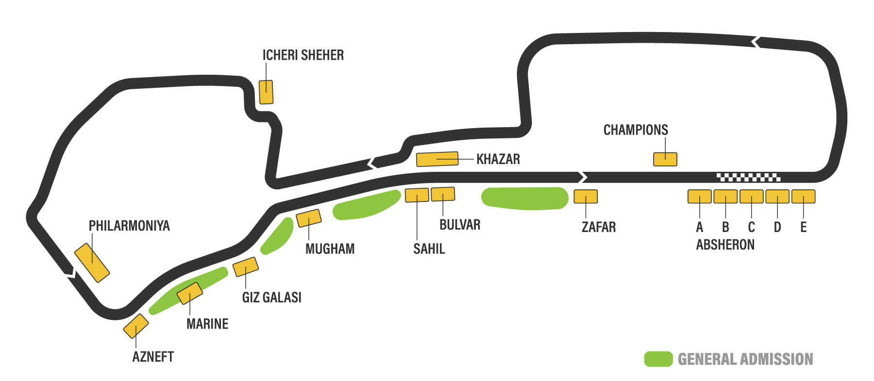 Ubicado directamente frente a la histórica Torre de la Doncella (Qiz Qalasi), el Giz Galasi Grandstand (Tribuna 6) ofrece un punto de vista excepcional para ver la carrera. Al elegir la tribuna Giz Galasi, tendrás una vista privilegiada de la curva 18, donde los coches suelen acelerar a toda velocidad frente a la Torre de la Doncella antes de dirigirse a la recta principal.